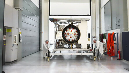 Spacecraft: Three-axis stabilised with 10 solar panels and a 2.5-metre-long High Gain Antenna, with a dry mass of approximately 2400 kg and a wet mass (including fuel) of approximately 6000 kg. Each solar panel measures about 2.5 m x 3.5 m; with five on each side of the spacecraft deployed as two distinctive cross-shaped arrays, these total an area of about 85 square metres